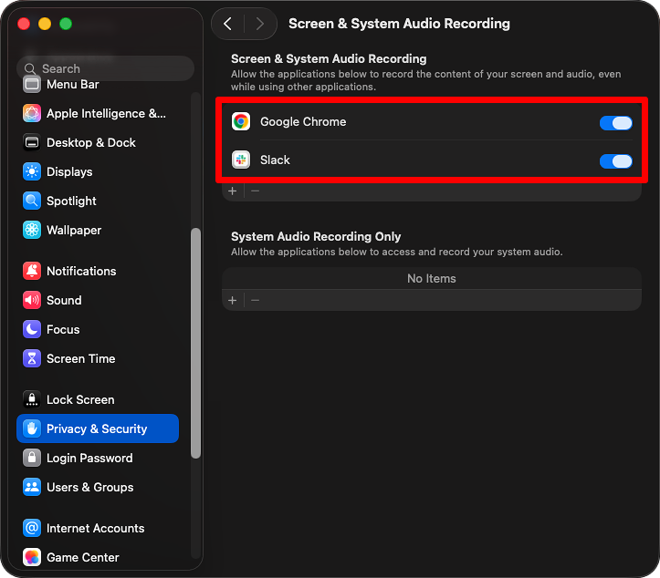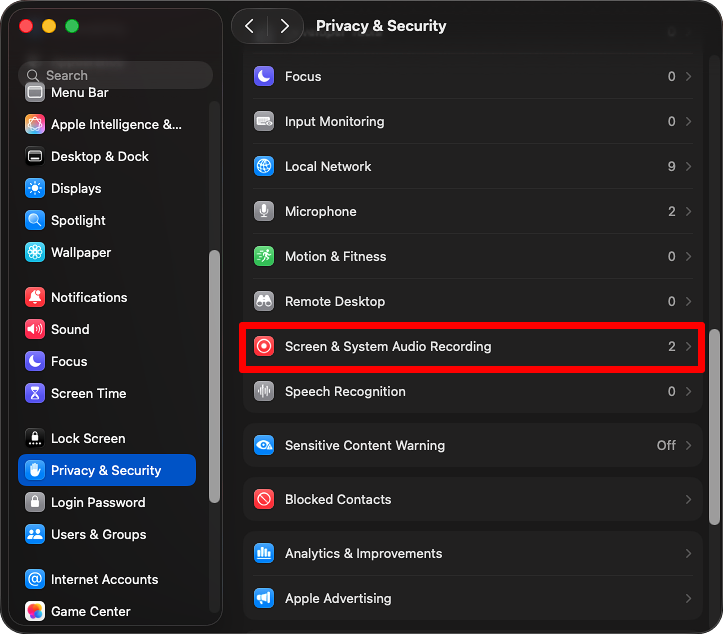 Scroll down and click on Screen & System Audio Recording in the right sidebar.