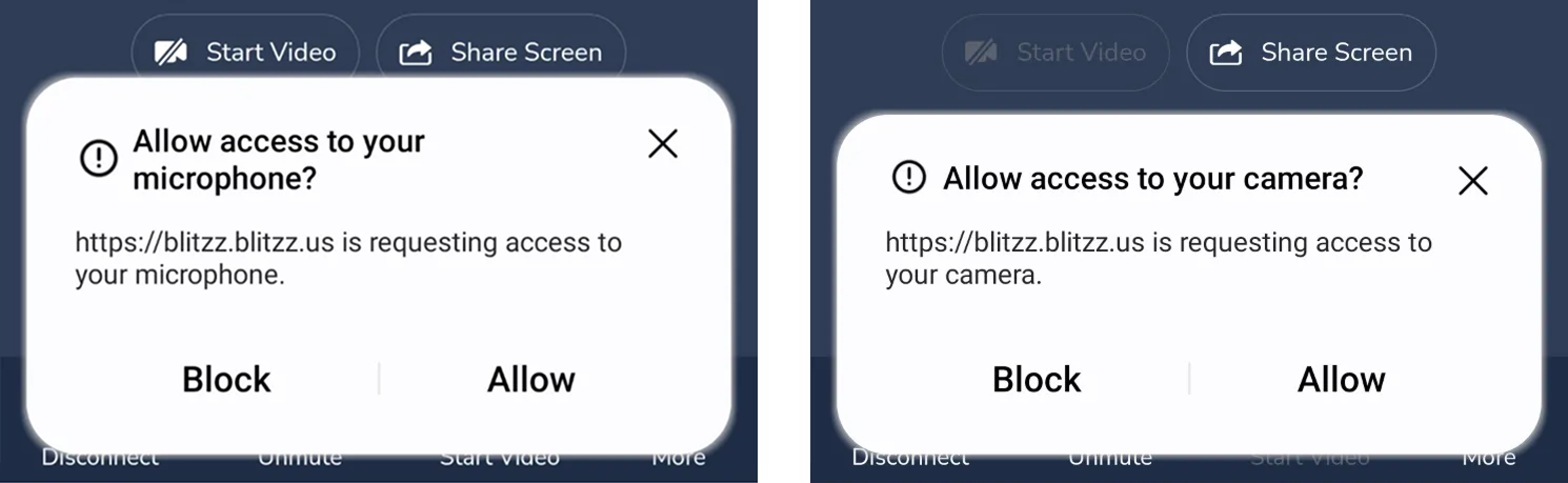 When prompted, tap Allow to grant access to your camera and microphone (and location if required for your call).