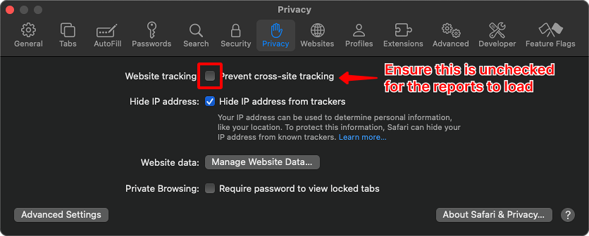 If you are using Safari on a Mac and Blitzz reports are not appearing or loading correctly, the issue may be caused by a Safari privacy setting that blocks certain content from loading. To ensure full functionality when accessing reports, you must disable the Cross-Site Tracking prevention setting in Safari.