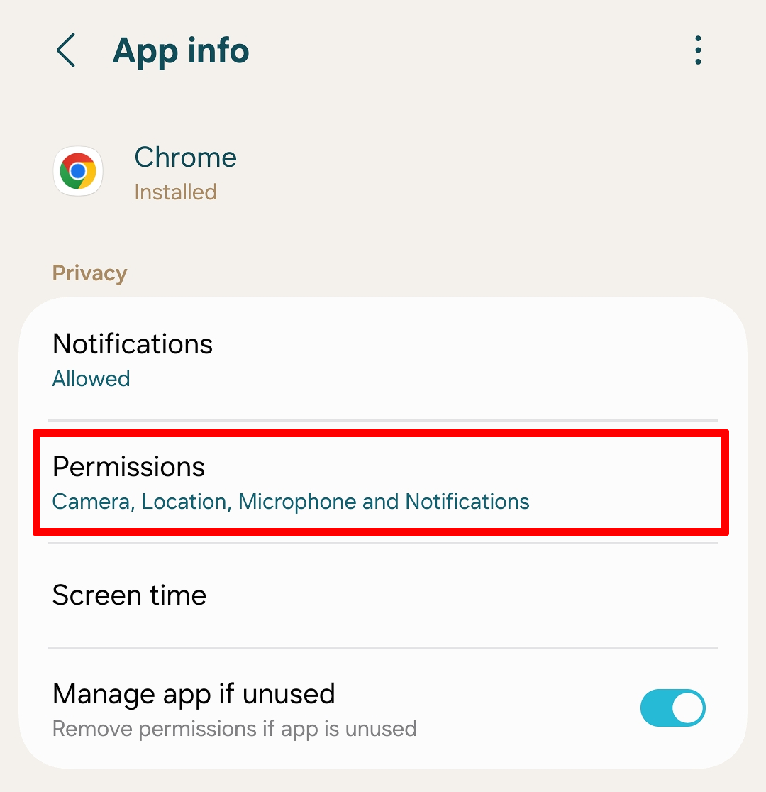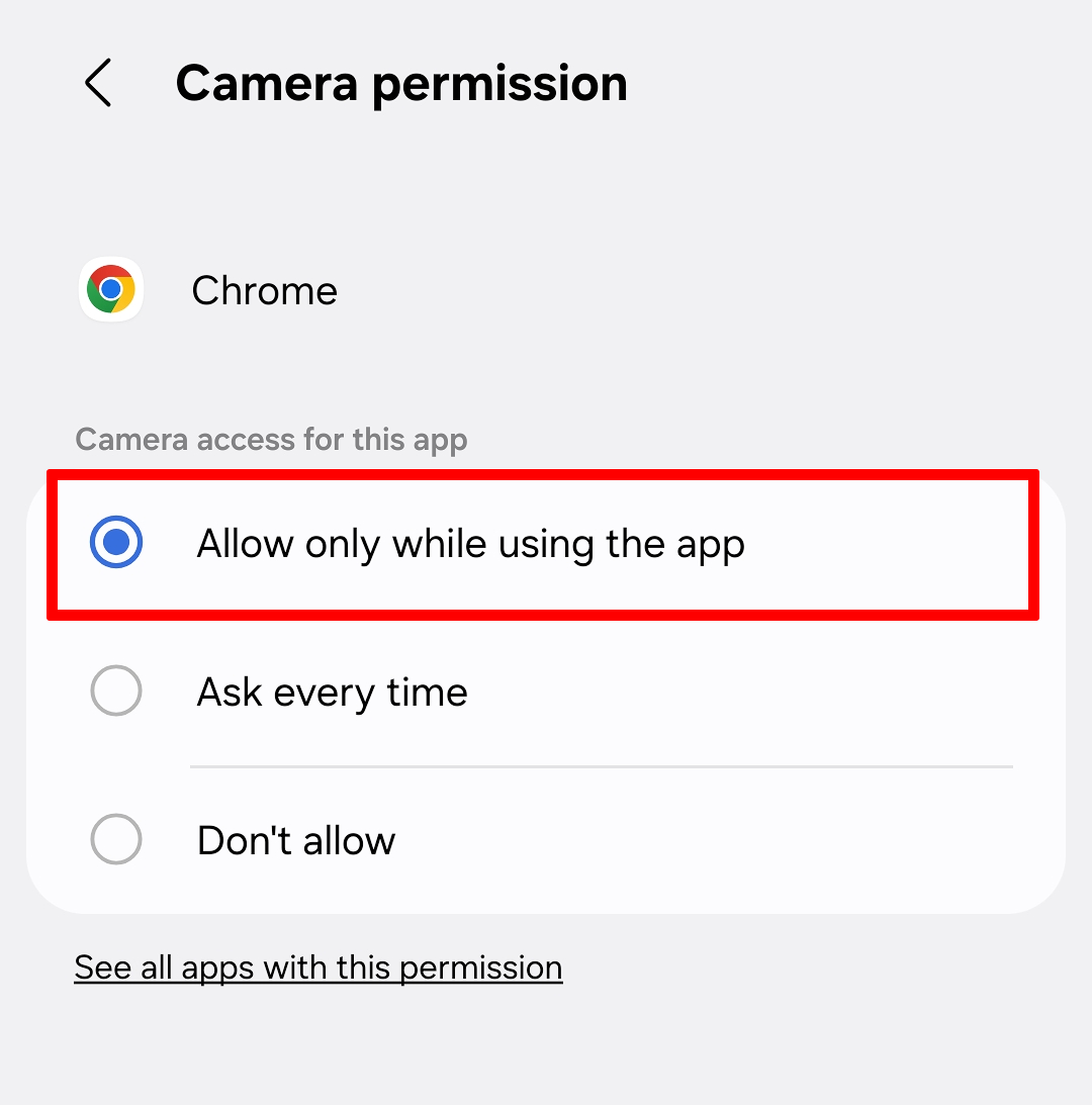 Step 5: Click on camera and set permission (Allow only while using the app) & also set microphone permission (Allow only while using the app).
