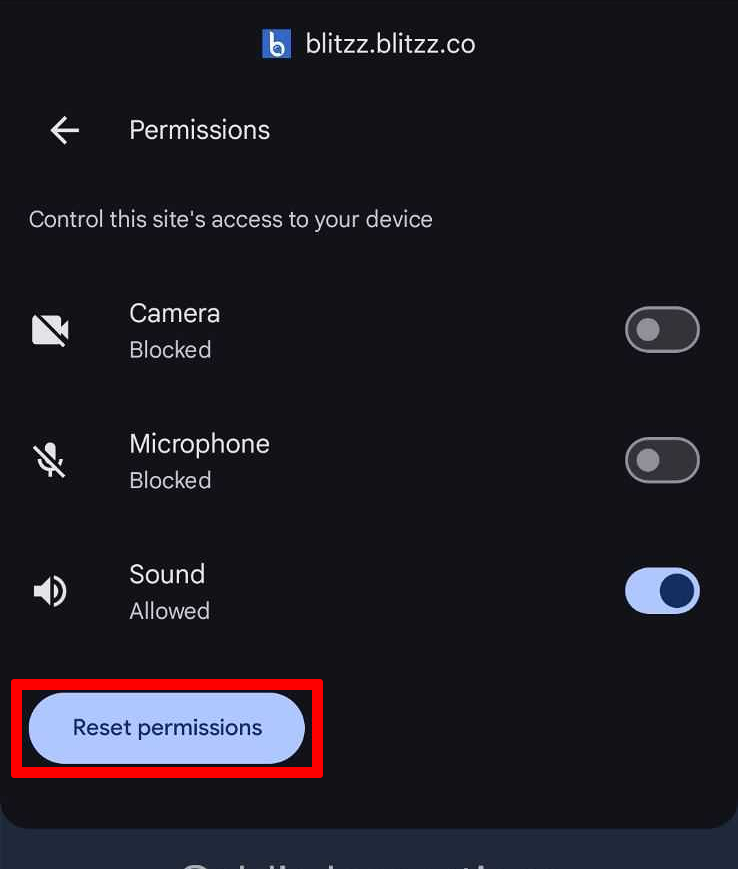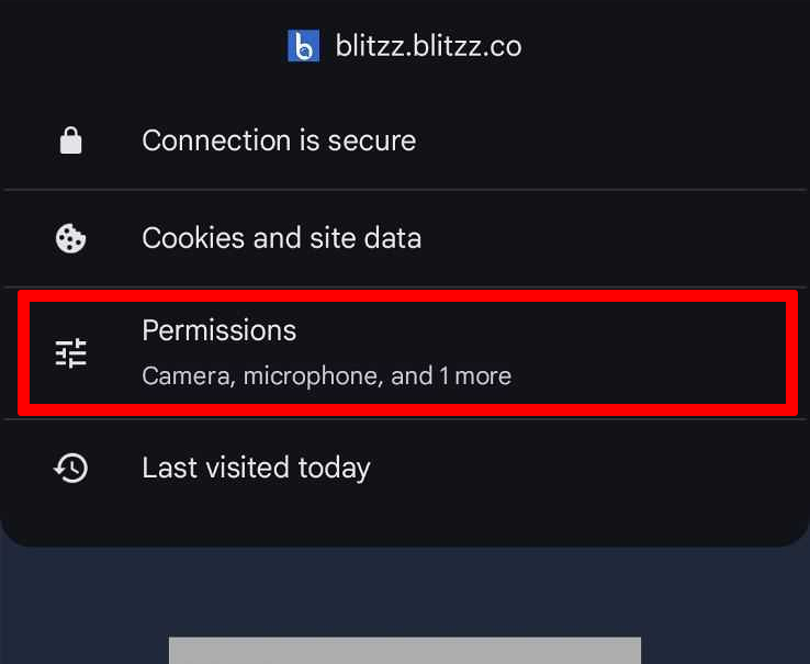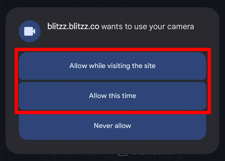 When you join a Blitzz call and click start video, you will be prompted to enable your camera (Allow while visiting the site/Allow this time) and mic (Allow while visiting the site/Allow this time)for use during a call. Please be sure to select Allow (Allow while visiting the site).