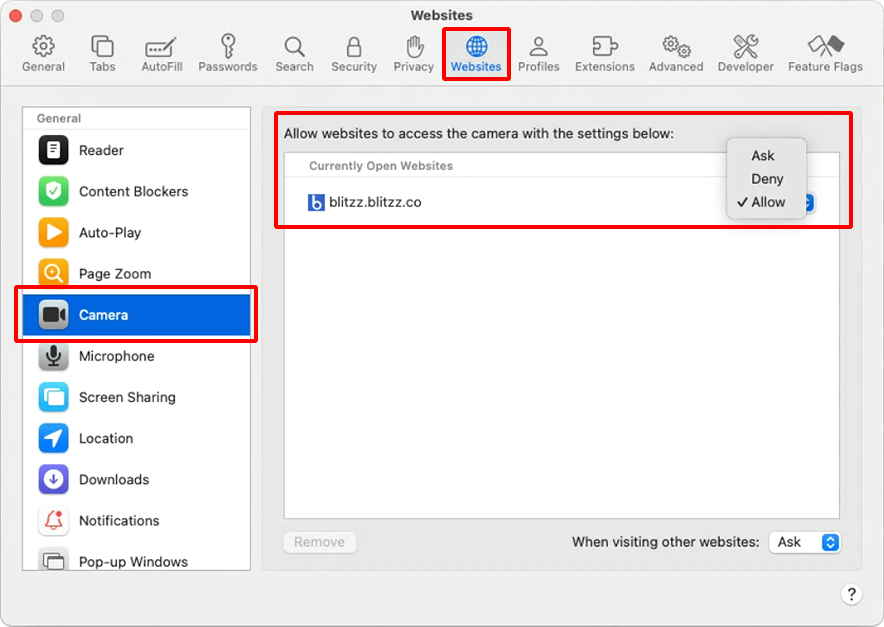 - Find the website in the right panel, Set it to Allow.