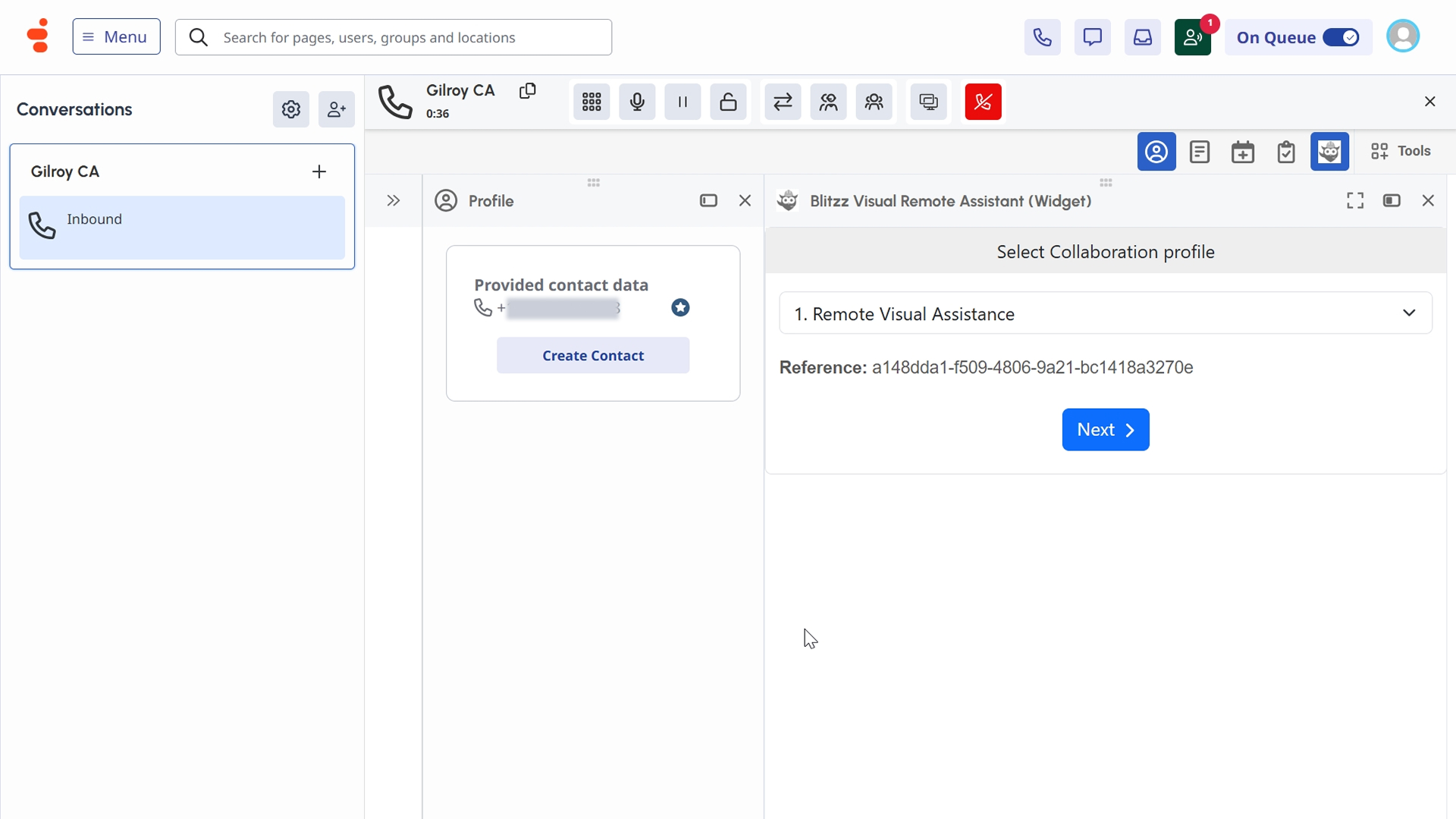 Select a Collaboration Profile. The customer's phone number is auto-populated from the Genesys interaction. Add an optional reference or case number.