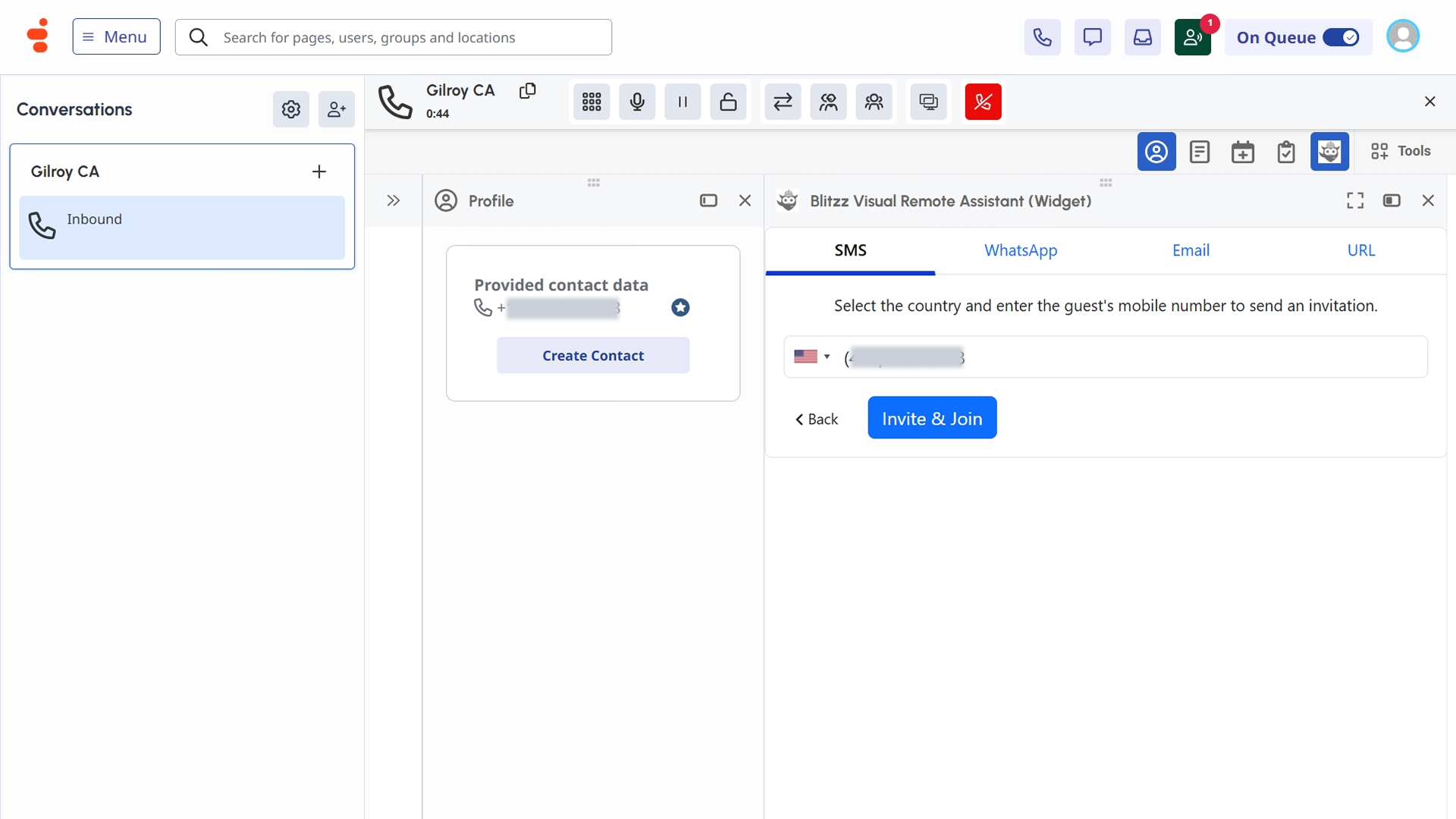 Select an invite method - such as SMS, WhatsApp, or Email - enter the required details, and click Invite & Join.