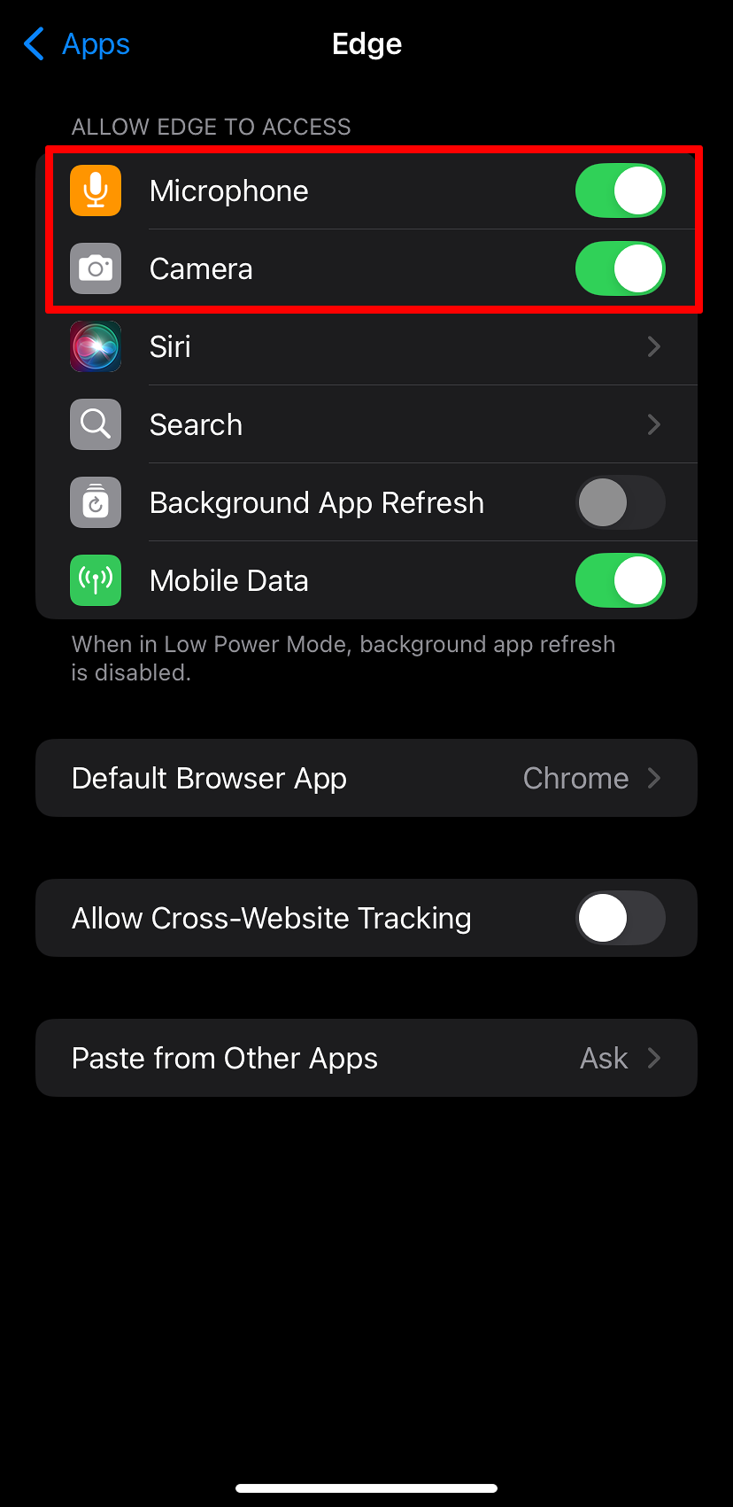 Step 2: Make sure your camera and microphone permissions are toggled ON.