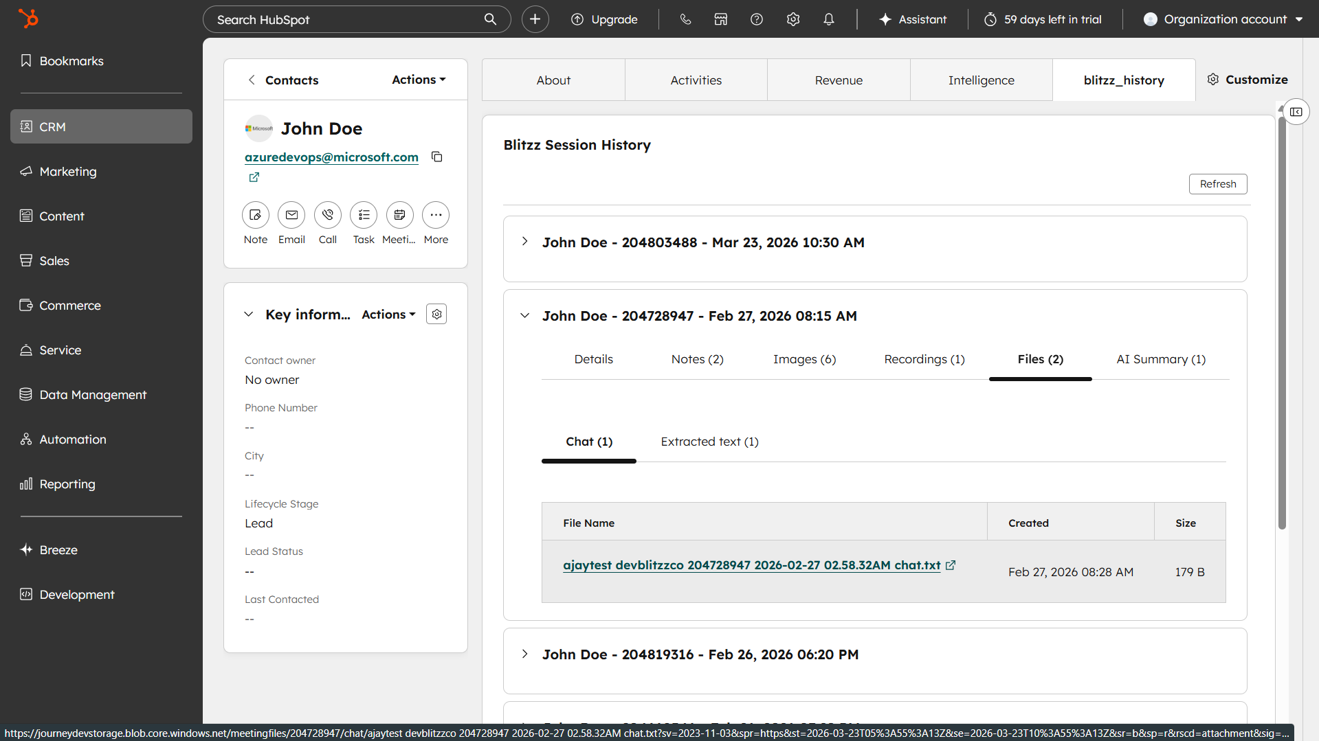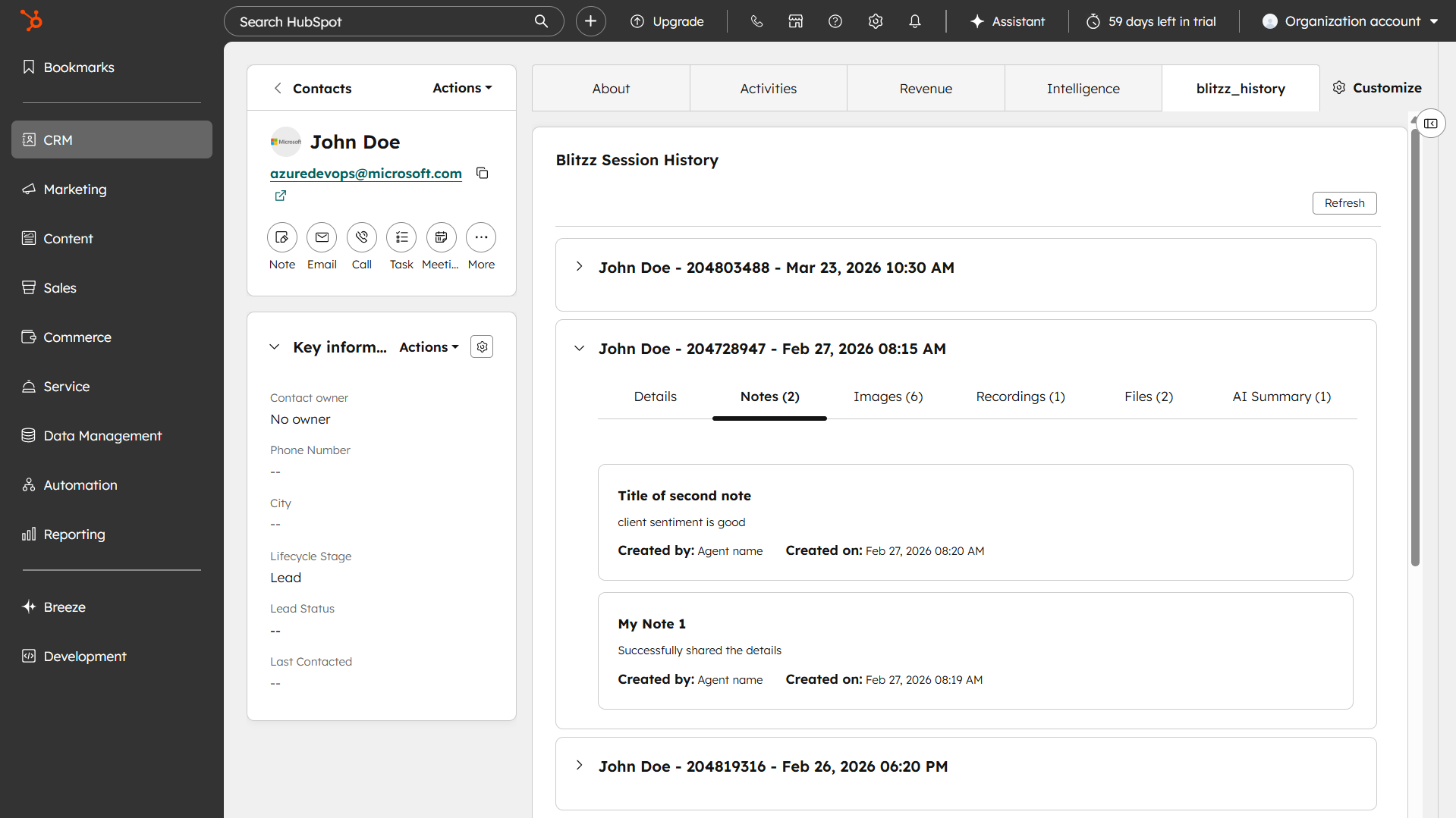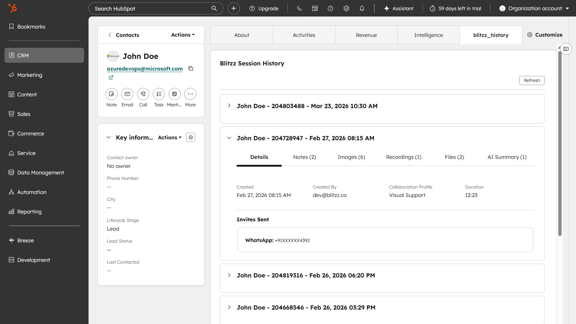 After a Blitzz session is completed, all session details are automatically saved and accessible directly within the contact's record in HubSpot via the blitzz_history tab.